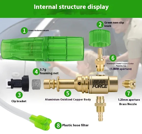 Durable 1L high-pressure foam sprayer bottle with adjustable snowflake spray angle. Made from aluminum copper plating and plastic, suitable for pressures from 100 to 180 bar (1400–2600 psi). Produces rich and thick foam, perfect for car washing and outdoor cleaning. Includes: 1 watering can.