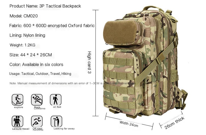 With a generous 30L capacity, this backpack has ample space for all your essentials, keeping you organized on the go. Weighing just 1.2 KG, it's lightweight yet robust enough to carry everything you need for your outdoor adventures. The dimensions of 44 * 24 * 26 CM make it compact enough to navigate through rugged terrains while still providing significant storage.