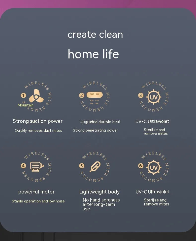 Efficiently eliminate mites and dust with the UV Mite Remover Vacuum Cleaner. Designed for use on mattresses, sofas, pillows, and more, this wireless device combines UV sterilization with powerful suction for a deep clean.