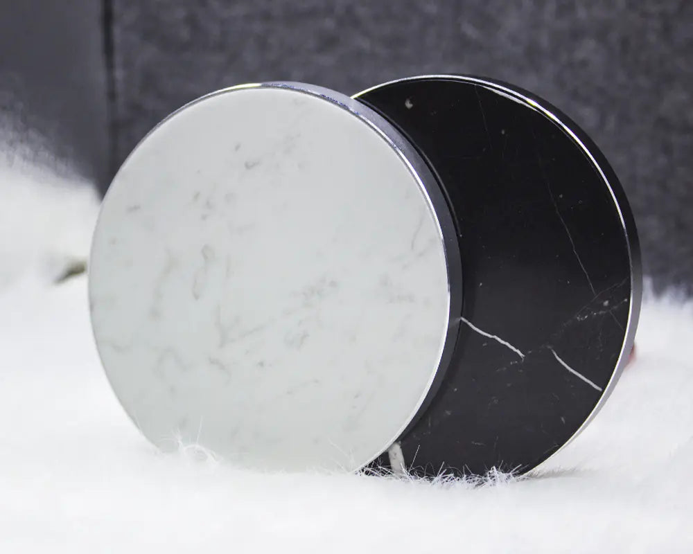 Sleek real marble 10W wireless charger compatible with Qi-enabled devices. Features fast charging, over-temperature protection, and elegant stone-metal construction. Ideal for iPhone and Android phones.
